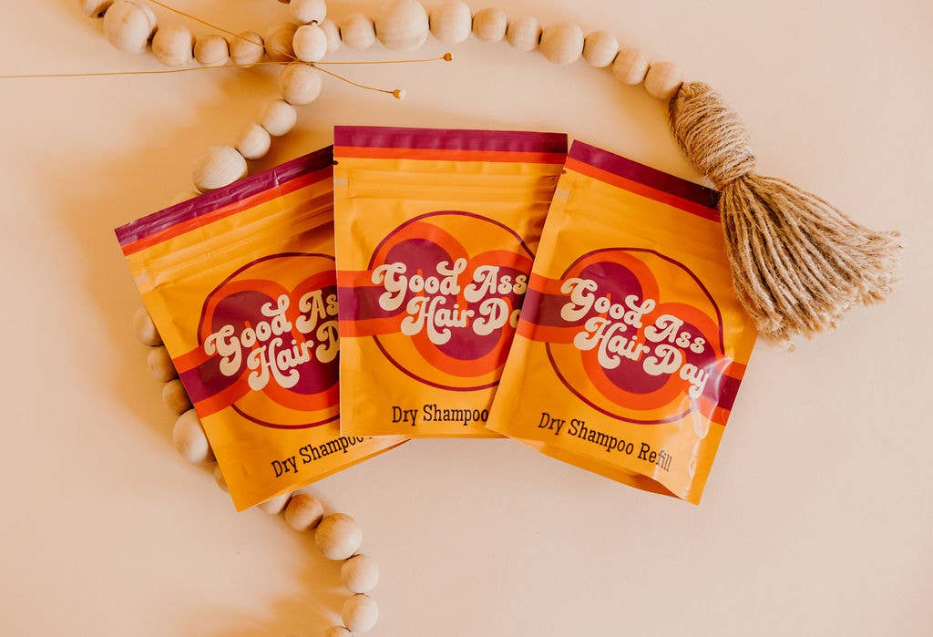 Refill powder for Good Ass Hair Day Dry Shampoo. Does NOT include bottle. Refill your GAHD bottle and help save the planet. Includes about a bottle and a half of powder. We recommend refilling your bottle with about half a bag. Do not overfill your GAHD bottle, or it may not come out properly. *Does not include funnel or scoop.